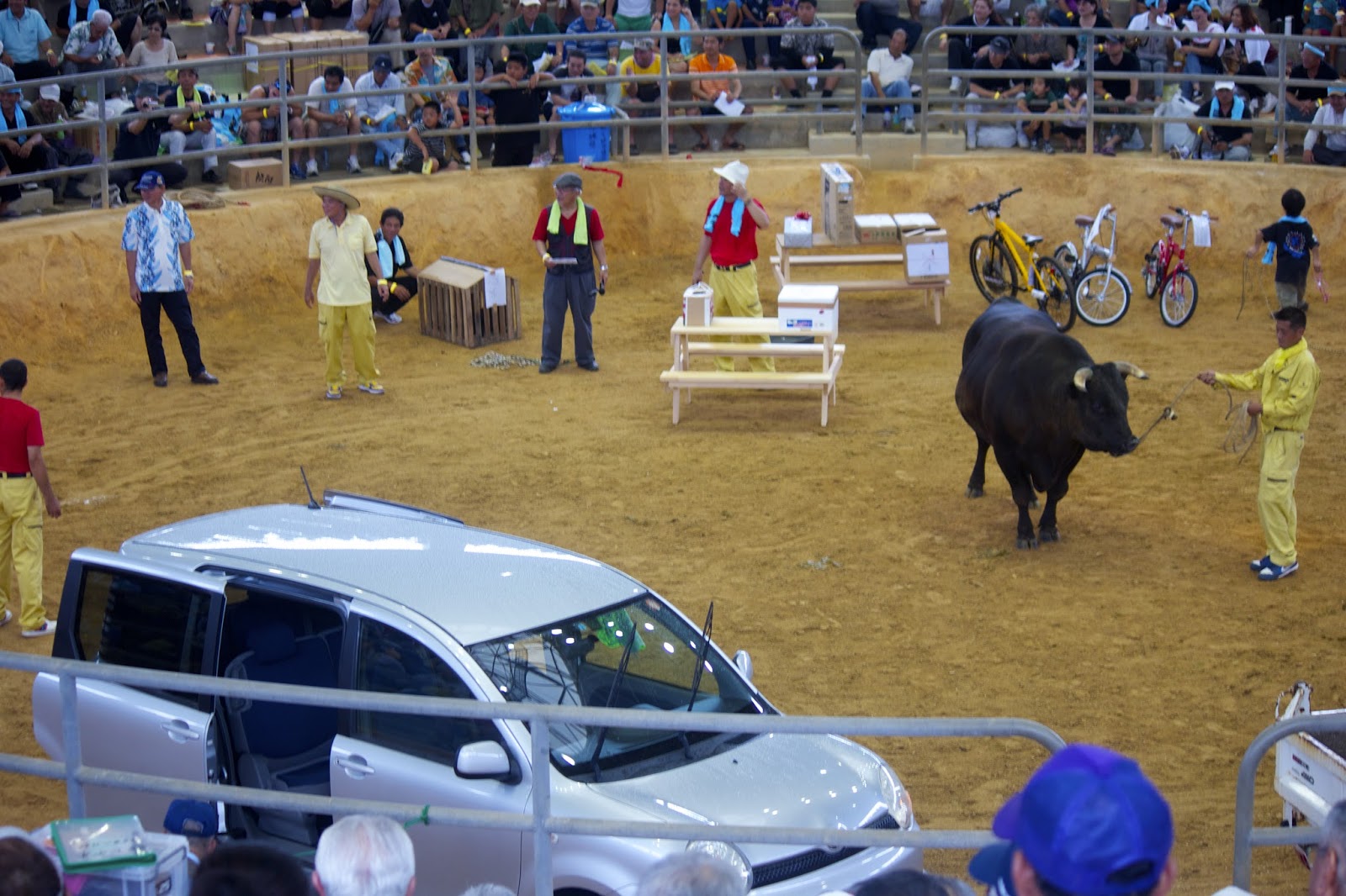 Mark and I live in Uruma City, which is known for bullfighting. So, we were definitely excited about checking out the big bullfighting event on Father's Day. The ring is in Ishikawa and parking is pretty terrible, but "when in Oki..." we parked on the sidewalk a street over!